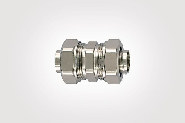 Mehrteilige Kompressionsverschraubung inkl. Polyamid-Dichtung zum Verbinden von zwei PCS-Schläuchen. Hervorragende Zugfestigkeit. Schlauchverbindung, Messing vernickelt.
