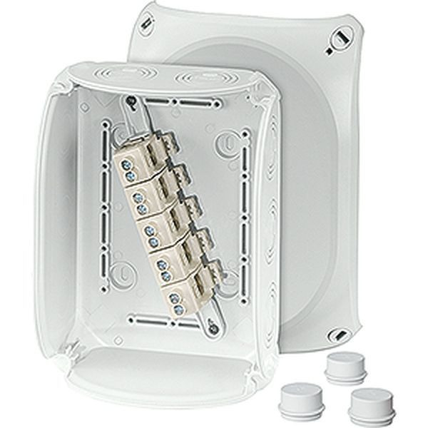 Kabelabzweigkasten aus hochwertigem Thermoplast. Für Aufputz-Anwendungen in Gebäuden oder die geschützte Installation im Freien. Mit Außenlaschen zur Befestigung und Deckelbefestigung über Schnellverschlüsse. Mit innovativer Klemmentechnik bis 10 mm², 5-polig. Kabeleinführung über metrische Vorprägungen in Gehäusewänden und Boden. Beigefügte Einsteckstutzen in Schutzart IP 55.
