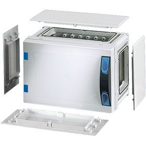 Gehäuse mit Tür für den Bau von Installationsverteilern bis 250 A für die Bedienung durch Laien nach IEC 61439-3. Offene Gehäusewände für die Kombination oder als Einzelgehäuse mit Verschlussplatten. Aus hochwertigem Polycarbonat, schutzisoliert. Schnelle Gehäuseverbindung durch Steckverbinder und integrierte Dichtungen. Große Wanddurchführungen für die elektrische Verbindung der Gehäuse untereinander. Kabeleinführung über Flansche. Wandbefestigung direkt am Gehäuse, über Außenlaschen oder mit Montageschienen. Leergehäuse mit nicht durchsichtiger Tür und plombierbarem Türverschluss mit Handbetätigung und Verschlussplatten-Set. Für den Einbau von Geräten auf Montageplatte oder DIN-Tragschiene, Einbaumaße B 216 x H 126 x T 140 mm. Max. Einbautiefe bei eingebauter Montageplatte 136 mm, bei eingebauter Tragschiene 125 mm.