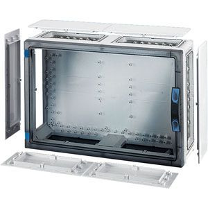 Hinweis: Einbaugeräte müssen für Laienbedienung geeignet sein oder abgedeckt werden. Gehäuse mit Tür für den Bau von Installationsverteilern bis 250 A für die Bedienung durch Laien nach IEC 61439-3. Offene Gehäusewände für die Kombination oder als Einzelgehäuse mit Verschlussplatten. Aus hochwertigem Polycarbonat, schutzisoliert. Schnelle Gehäuseverbindung durch Steckverbinder und integrierte Dichtungen. Große Wanddurchführungen für die elektrische Verbindung der Gehäuse untereinander. Kabeleinführung über Flansche. Wandbefestigung direkt am Gehäuse, über Außenlaschen oder mit Montageschienen. Leergehäuse mit transparenter Tür und plombierbarem Türverschluss mit Handbetätigung und Verschlussplatten-Set. Für den Einbau von Geräten auf Montageplatte oder DIN-Tragschiene, Einbaumaße B 486 x H 306 x T 140 mm. Max. Einbautiefe bei eingebauter Montageplatte 136 mm, bei eingebauter Tragschiene 125 mm.