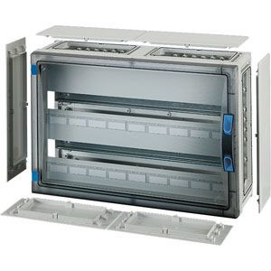 Gehäuse mit Tür für den Bau von Installationsverteilern bis 250 A für die Bedienung durch Laien nach IEC 61439-3. Offene Gehäusewände für die Kombination oder als Einzelgehäuse mit Verschlussplatten. Aus hochwertigem Polycarbonat, schutzisoliert. Schnelle Gehäuseverbindung durch Steckverbinder und integrierte Dichtungen. Große Wanddurchführungen für die elektrische Verbindung der Gehäuse untereinander. Kabeleinführung über Flansche. Wandbefestigung direkt am Gehäuse, über Außenlaschen oder mit Montageschienen. Automatengehäuse mit 54 Teilungseinheiten zum Einbau von Reiheneinbaugeräten nach DIN 43880. Mit PE- und N-Klemmen für Kupferleiter. N trennbar für unterschiedliche Potenziale. Mit Abdeckstreifen zum Verschließen von nicht benutzten Geräteausschnitten und Beschriftungsstreifen für die Stromkreiskennzeichnung. Transparente Tür und plombierbarer Türverschluss mit Handbetätigung. Mit Verschlussplatten-Set.