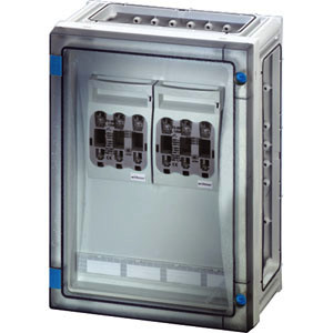3polig 125 A, 2 x NH 00C Gehäuse mit Tür für den Bau von Installationsverteilern bis 250 A für die Bedienung durch Laien nach IEC 61439-3. Offene Gehäusewände für die Kombination oder als Einzelgehäuse mit Verschlussplatten. Aus hochwertigem Polycarbonat, schutzisoliert. Schnelle Gehäuseverbindung durch Steckverbinder und integrierte Dichtungen. Große Wanddurchführungen für die elektrische Verbindung der Gehäuse untereinander. Kabeleinführung über Flansche. Wandbefestigung direkt am Gehäuse, über Außenlaschen oder mit Montageschienen. Gehäuse mit Sicherungslasttrennschaltern NH 00C, 3-polig, nach IEC 60947-3 auf Montageplatte. Mit Zuleitungsklemmen, PE- und N-Klemmen. Mit Brücke zur Aufteilung der Zuleitung. Anschlussraum veränderbar. Mit transparenter Tür und Türverschluss mit Werkzeugbetätigung.