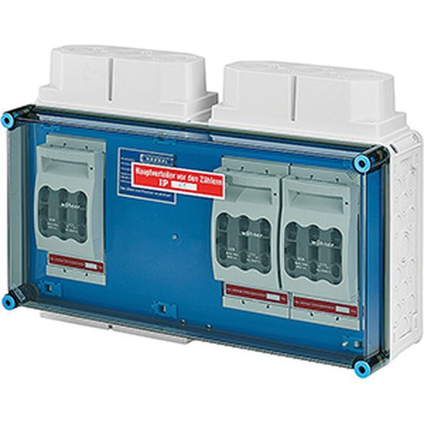 Gehäuse für den Bau von Energie-Schaltgerätekombinationen bis 630 A oder als Einzelgehäuse. Aus hochwertigem Polycarbonat schutzisoliert. Wanddurchführungen mit großen Öffnungen für die elektrische Verbindung der Gehäuse untereinander. Kabeleinführung an allen Gehäusewänden über metrische Vorprägungen oder Anbauflansche. Gehäuse zur Wandbefestigung auch über Außenlaschen oder mit Montageschienen. Anschlussfertiger Hauptleitungsverteiler für den Vorzählerbereich, plombierbar, mit 3 Sicherungslasttrennschaltern NH 00, 3-polig, auf 5-poligem Sammelschienensystem 250 A. Einsatz im ungemessenen Bereich nach Absprache mit örtlichem Netzbetreiber.