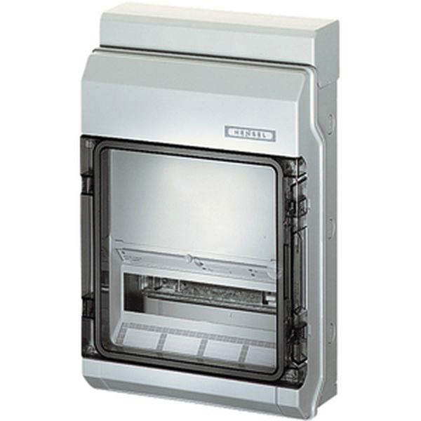 aus Thermoplast, grau nach RAL 7035, Schutzart IP 65, zum Einbau von Geräten mit Schnappbefestigung auf DIN-Tragschiene, Hutprofil 35 mm, Bemessungsisolationsspannung AC 400 V, mit transparenter Tür, mit Abdeckstreifen für den Geräteausschnitt, mit Raum für bedienungsunabhängige Geräte und jeweils einer zusätzlichen DIN Tragschiene.