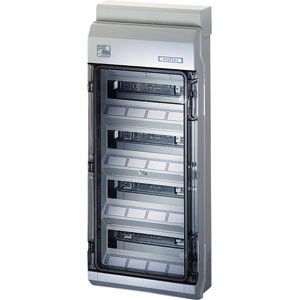 Kleinverteiler aus hochwertigem Thermoplast (Polycarbonat). Für Aufputz-Anwendungen für die ungeschützte Installation im Freien oder in Gebäuden. Automatengehäuse, mit 48 Teilungseinheiten, zum Einbau von Geräten mit Schnappbefestigung auf DIN-Tragschiene. Kabeleinführung über integrierte elastische Dichtmembranen. Mit transparenter Tür und Kabeleinführungsblende, integriertem Zubehörfach und Abdeckstreifen für den Geräteausschnitt. Schutzart IP 65.