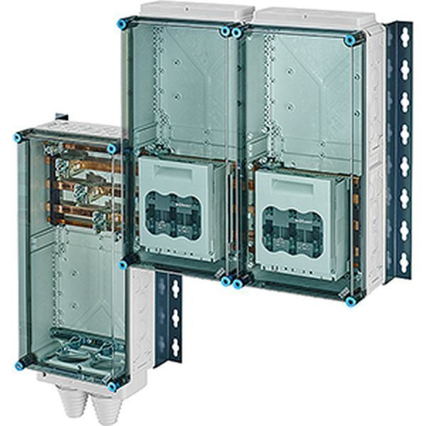 Gehäuse für den Bau von Energie-Schaltgerätekombinationen bis 630 A oder als Einzelgehäuse. Aus hochwertigem Polycarbonat schutzisoliert. Wanddurchführungen mit großen Öffnungen für die elektrische Verbindung der Gehäuse untereinander. Kabeleinführung an allen Gehäusewänden über metrische Vorprägungen oder Anbauflansche. Gehäuse zur Wandbefestigung auch über Außenlaschen oder mit Montageschienen. Anschlussfertiger Verteiler mit 2 Sicherungslasttrennschaltern NH 1, 3-polig, auf 5-poligem Sammelschienensystem 400 A.