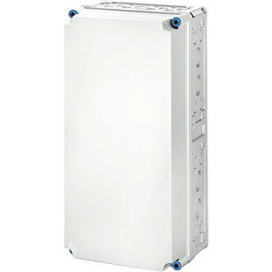Gehäuse für den Bau von Energie-Schaltgerätekombinationen bis 630 A oder als Einzelgehäuse. Aus hochwertigem Polycarbonat schutzisoliert. Wanddurchführungen mit großen Öffnungen für die elektrische Verbindung der Gehäuse untereinander. Kabeleinführung an allen Gehäusewänden über metrische Vorprägungen oder Anbauflansche. Gehäuse zur Wandbefestigung auch über Außenlaschen oder mit Montageschienen. Leergehäuse mit nicht durchsichtigem Deckel. Einbaumaße B 275 x H 575 x T 195 mm für den Einbau von Geräten auf Montageplatte oder DIN-Tragschiene. Max. Einbautiefe bei eingebauter Montageplatte 191 mm, bei eingebauter Tragschiene 180 mm. Deckelverschlüsse mit Werkzeugbetätigung.