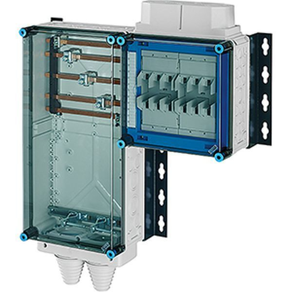 Gehäuse für den Bau von Energie-Schaltgerätekombinationen bis 630 A oder als Einzelgehäuse. Aus hochwertigem Polycarbonat schutzisoliert. Wanddurchführungen mit großen Öffnungen für die elektrische Verbindung der Gehäuse untereinander. Kabeleinführung an allen Gehäusewänden über metrische Vorprägungen oder Anbauflansche. Gehäuse zur Wandbefestigung auch über Außenlaschen oder mit Montageschienen. Anschlussfertiger Verteiler mit 2 Sicherungsunterteilen NH 00, 3-polig, auf 5-poligem Sammelschienensystem 250 A.