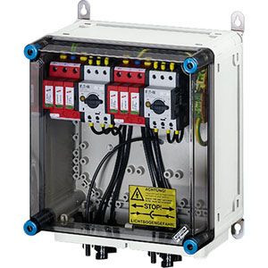 2 x PV-String auf 2 x Wechselrichter-Eingang PV-Anschlussgehäuse für PV-Anlagen bis 1000 V d.c. nach IEC 61439, komplett montiert und anschlussfertig verdrahtet. Die Gehäuse aus hochwertigem Thermoplast sind schutzisoliert, Schutzart IP 65. Nach Bedarf sind PV-Anschlussgehäuse mit DC-Überspannungsableitern, DC-Generatorfreischaltern und Strangsicherungen ausgestattet. Sie sind für die geschützte Installation im Freien geeignet und UV-beständig. Die Wandbefestigung erfolgt über Außenlaschen aus Edelstahl. PV-Anschlussgehäuse mit 2 DC-Überspannungsbleitern Typ 2 und 2 DC-Generatorfreischaltern. 2 x PV-Strang auf 2 x Wechselrichter-Eingang. Die Steckanschlüsse sind kompatibel zu MC4. Deckelverschlüsse für Werkzeugbetätigung.