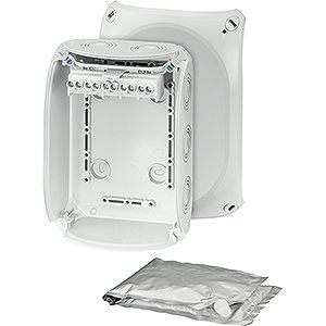 Kabelabzweigkasten aus hochwertigem Thermoplast zum Vergießen für eine wasserdichte Verbindung. Für die ungeschützte Installation im Freien bei Gefahr von Kondenswasserbildung und/oder Eintritt von Flüssigkeiten, zur Montage im Erdreich ohne Verkehrslasten. Verwendbar für Heizkabel / Heizband bis max. 70 °C Oberflächentemperatur. Für Nachinstallationen oder Prüfungen kann der Deckel abgenommen und die Vergussmasse entfernt werden. Deckelbefestigung über Schnellverschlüsse. Mit Außenlaschen zur Befestigung. Mit Klemmen bis 6 mm², 5-polig. Kabeleinführung über metrische Vorprägungen in Gehäusewänden. Anbau-Kabelstutzen im Zubehör. Mit Vergussmasse und Verschlussstopfen.