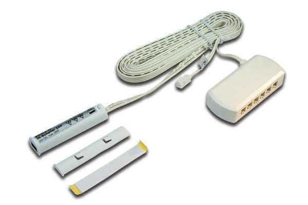 Berührungsloser IR-Schalter zum Anschluss von LED-Leuchten mit 24V, Anschlussleitung 2,5m mit LED 24-Stecker, Schaltleiteitung 2,5m mit 11-fach Verteiler, Zur Montage in 14,5mm Bohrungen oder zum ankleben mit beiliegendem Klebepad, am Schalter kann zwischen folgenden beiden Funktionen gewählt werden: Funktion 1 (Lieferzustand): Lichteinschaltung mit erster Bewegung, -ausschaltung mit folgender, Funktion 2: Beim Öffnen der Tür schaltet sich das Licht ein und beim Schließen der Tür wieder aus, zur Überwachung mehrerer Türen können bis zu 11 Schalter parallel angeschlossen werden