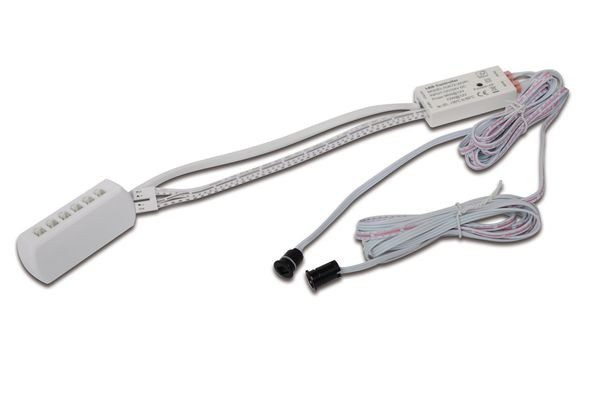 Berührungsloser IR-Schalter zum Anschluss von LED-Leuchten mit 24V, Anschlussleitung 0,2m mit LED 24-Stecker, Schaltleitung 0,2m mit 12-fach Verteiler, Sensorleitung 4m, zur Montage in 10mm Bohrungen, am Schalter kann zwischen folgenden beiden Funktionen gewählt werden: Funktion 1 (Lieferzustand): Lichteinschaltung mit erster Bewegung, -ausschaltung mit folgender, Funktion 2: Beim Öffnen der Tür schaltet sich das Licht ein und beim Schließen der Tür wieder aus, bei 2 Sensoren geht das Licht an, sobald eine Tür geöffnet wird