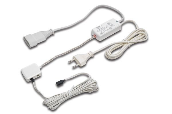 Berührungsloser IR-Schalter zum Anschluss von Leuchten-Betriebsgeräten der Schutzklasse II, Anschlussleitung 2m mit Eurostecker, Schaltleitung 0,3m mit Eurokupplung, Sensorleitung 3m mit Sensorkopf K80, Schalt-Funktion: Lichteinschaltung mit erster Bewegung, -ausschaltung mit folgender