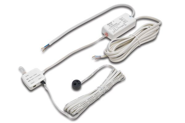 Berührungsloser Türkontakt-Schalter zum Anschluss von Leuchten-Betriebsgeräten der Schutzklasse II, Netzanschlussleitung 3m und Schaltleitung 0,3m jeweils abgemantelt und mit Aderendhülsen zum einfachen Anschließen an Schraub- oder Steckklemmen, Sensorleitung 3m mit Sensorkopf K59, Schalt-Funktion: Beim Öffnen der Tür schaltet sich das Licht ein und beim Schließen der Tür wieder aus.