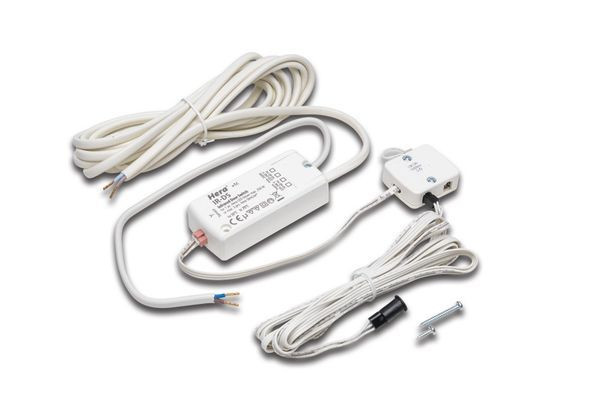 Berührungsloser Türkontakt-Schalter zum Anschluss von Leuchten-Betriebsgeräten der Schutzklasse II, Netzanschlussleitung 3m und Schaltleitung 0,3m jeweils abgemantelt und mit Aderendhülsen zum einfachen Anschließen an Schraub- oder Steckklemmen, Sensorleitung 3m mit Sensorkopf K60, Schalt-Funktion: Beim Öffnen der Tür schaltet sich das Licht ein und beim Schließen der Tür wieder aus.