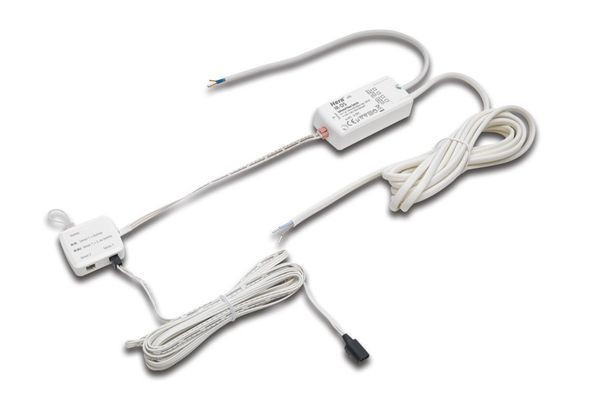 Berührungsloser Türkontakt-Schalter zum Anschluss von Leuchten-Betriebsgeräten der Schutzklasse II, Netzanschlussleitung 3m und Schaltleitung 0,3m jeweils abgemantelt und mit Aderendhülsen zum einfachen Anschließen an Schraub- oder Steckklemmen, Sensorleitung 3m mit Sensorkopf K80, Schalt-Funktion: Beim Öffnen der Tür schaltet sich das Licht ein und beim Schließen der Tür wieder aus.