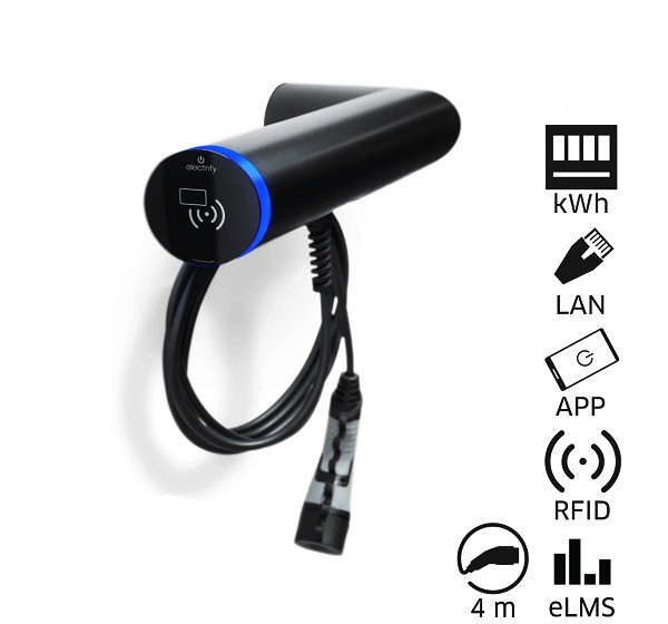 Wallbox, Ausrichtung waagerecht links, Ausführung SMART, schwarz matt pulverbeschichtet (RAL 9005), max. Ladeleistung 22kW, max. Ladestrom 32A, MID-konformer Energiezähler, DC-Fehlerstromerkennung, im Innen- und Außenbereich frei positionierbar, Autorisierung über RFID oder Smartphone über eCC App (electrify Charge Control), Plug and Start, LAN und WLAN und digitale Eingänge, Master / Slave via electrify Mesh, Modbus TCP, OCPP Einbindung, kostenloses Backend über eLMS (electrify Lademanagementsystem), 4 Meter Ladekabel (Typ 2), Klimasystem durch Axiallüfter und Heizung, Schutzart IP 54, einfache Montage, incl. 2x RFID-Karte, Wandadapter zur Aufputzinstallation, Befestigungsmaterial, Adapter digitale Eingänge, Gerätepass, Montagekurzanleitung
