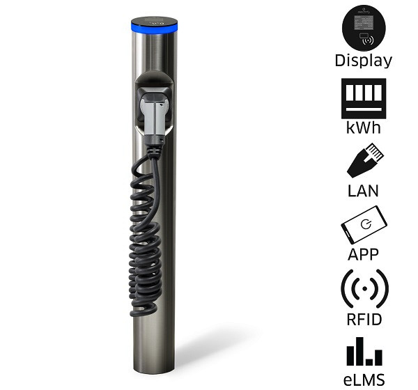 Ladesäule, Ausführung Premium, 2,4 Zoll Farbdisplay zur Anzeige von Ladeinformationen, Edelstahl gebürstet, max. Ladeleistung 11kW, max. Ladestrom 16A, MID-konformer Energiezähler, DC-Fehlerstromerkennung, im Innen- und Außenbereich frei positionierbar, Autorisierung über RFID oder Smartphone über eCC App (electrify Charge Control), Plug and Start, LAN und WLAN und digitale Eingänge, Master / Slave via electrify Mesh, OCPP Einbindung, Modbus TCP, kostenloses Backend über eLMS (electrify Lademanagementsystem), 4 Meter Spiralkabel (Typ 2), Klimasystem durch Axiallüfter und Heizung, Schutzart IP 54, einfache Montage, incl. 2x RFID-Karte, Fundamentgestell, Befestigungsmaterial, Adapter digitale Eingänge, Gerätepass, Montagekurzanleitung