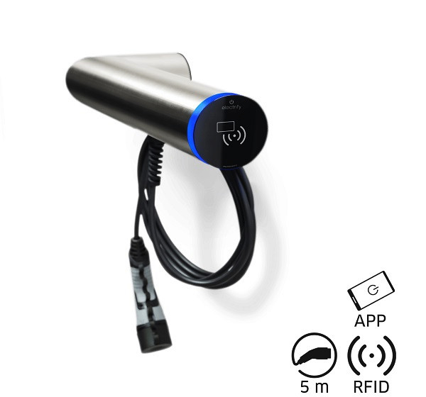 Wallbox Sonderkabellänge, Ausrichtung waagerecht rechts, Ausführung BASE, Edelstahl gebürstet, max. Ladeleistung 11kW, max. Ladestrom 16A, DC-Fehlerstromerkennung, im Innen- und Außenbereich frei positionierbar, Autorisierung über RFID oder Smartphone über eCC App (electrify Charge Control), Plug and Start, WLAN und digitale Eingänge, Master / Slave via electrify Mesh, Modbus TCP, 5 Meter Ladekabel (Typ 2), Klimasystem durch Axiallüfter und Heizung, Schutzart IP 54, einfache Montage, incl. 1x RFID-Karte, Wandadapter zur Aufputzinstallation, Befestigungsmaterial, Adapter digitale Eingänge, Gerätepass, Montagekurzanleitung