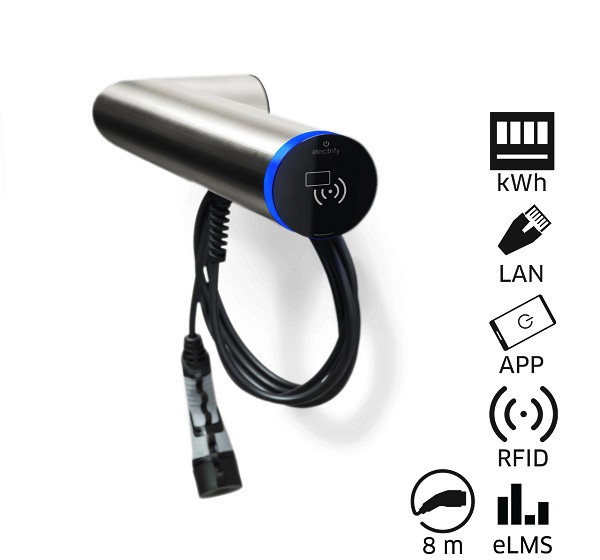 Wallbox Sonderkabellänge, Ausrichtung waagerecht rechts, Ausführung SMART, Edelstahl gebürstet, max. Ladeleistung 11kW, max. Ladestrom 16A, MID-konformer Energiezähler, DC-Fehlerstromerkennung, im Innen- und Außenbereich frei positionierbar, Autorisierung über RFID oder Smartphone über eCC App (electrify Charge Control), Plug and Start, LAN und WLAN und digitale Eingänge, Master / Slave via electrify Mesh, Modbus TCP, OCPP Einbindung, kostenloses Backend über eLMS (electrify Lademanagementsystem), 8 Meter Ladekabel (Typ 2), Klimasystem durch Axiallüfter und Heizung, Schutzart IP 54, einfache Montage, incl. 2x RFID-Karte, Wandadapter zur Aufputzinstallation, Befestigungsmaterial, Adapter digitale Eingänge, Gerätepass, Montagekurzanleitung