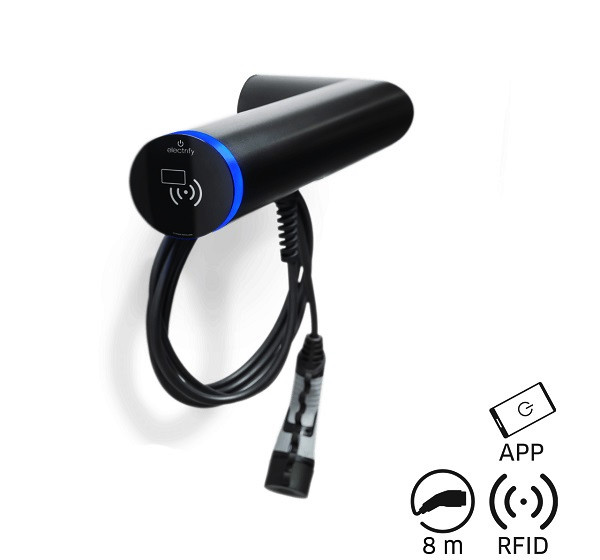 Wallbox Sonderkabellänge, Ausrichtung waagerecht links, Ausführung BASE, schwarz matt pulverbeschichtet (RAL 9005), max. Ladeleistung 11kW, max. Ladestrom 16A, DC-Fehlerstromerkennung, im Innen- und Außenbereich frei positionierbar, Autorisierung über RFID oder Smartphone über eCC App (electrify Charge Control), Plug and Start, WLAN und digitale Eingänge, Master / Slave via electrify Mesh, Modbus TCP, 8 Meter Ladekabel (Typ 2), Klimasystem durch Axiallüfter und Heizung, Schutzart IP 54, einfache Montage, incl. 1x RFID-Karte, Wandadapter zur Aufputzinstallation, Befestigungsmaterial, Adapter digitale Eingänge, Gerätepass, Montagekurzanleitung
