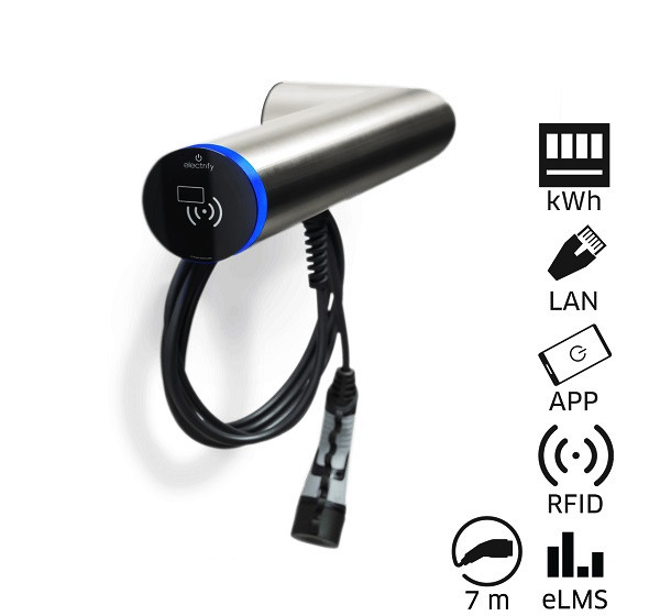 Wallbox Sonderkabellänge, Ausrichtung waagerecht links, Ausführung SMART, Edelstahl gebürstet, max. Ladeleistung 22kW, max. Ladestrom 32A, MID-konformer Energiezähler, DC-Fehlerstromerkennung, im Innen- und Außenbereich frei positionierbar, Autorisierung über RFID oder Smartphone über eCC App (electrify Charge Control), Plug and Start, LAN und WLAN und digitale Eingänge, Master / Slave via electrify Mesh, Modbus TCP, OCPP Einbindung, kostenloses Backend über eLMS (electrify Lademanagementsystem), 7 Meter Ladekabel (Typ 2), Klimasystem durch Axiallüfter und Heizung, Schutzart IP 54, einfache Montage, incl. 2x RFID-Karte, Wandadapter zur Aufputzinstallation, Befestigungsmaterial, Adapter digitale Eingänge, Gerätepass, Montagekurzanleitung