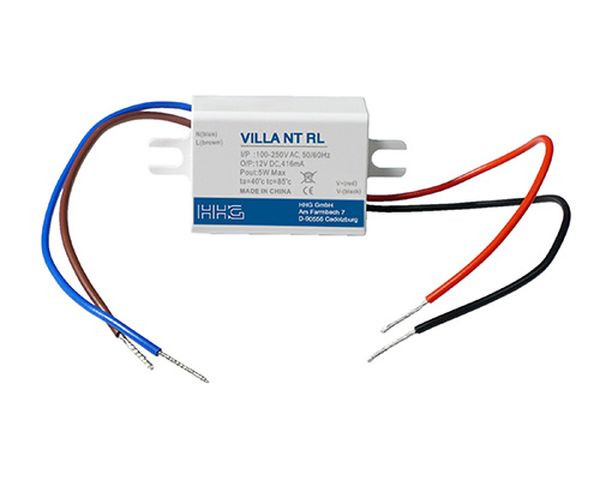 Netzteil UP 230 V AC Eingang, 12 V DC Ausgang, 416 mA, 5 W, kann als Spannungsversorgung für VILLA RL 12 V bei vorliegender Anschlussspannung 230 V AC verwendet werden, Schutzart IP 31, inkl. Anschlussleitungen, zur Montage in UP/AP-Dosen, Abmessungen 55 x 26 x 23 mm