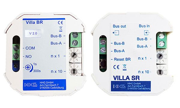Das Busüberwachungs- und Alarmmodul Set bestehend aus Villa SR Sicherheitsmodul und Villa BR Schaltrelais dient zum Schutz eines Busgerätes gegen mögliche Manipulation oder Sabotage. Wird die Türstation wegen einer möglichen Manipulation oder Sabotage außer Betrieb gesetzt, wird das Relais für den Türöffner gesperrt und kein Zutritt mehr erlaubt. Parallel dazu kann das Modul bei einem am Bus angeschlossenes Signalgerät (z.B. Sirene, Blitzlicht, Hupe) den Alarm auslösen. Spannung aus Villa 2-Draht Bus (30V DC), 50 mA, Abmessungen Villa SR: 50 x 49 x 22 mm, Gewicht 35g, Schutzart IP 20, Abmessungen Villa BR: 50 x 49 x 22 mm, Gewicht 35g, Schutzart IP 20