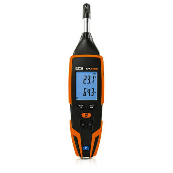 Das HTA106 misst Lufttemperatur, Luftfeuchtigkeit und den Taupunkt mit einem integrierten Sensor. Es ist mit einer Hintergrundbeleuchtung ausgestattet, um das Ablesen in schlecht beleuchteten Umgebungen zu erleichtern.