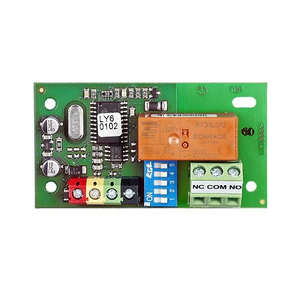 Bus-Schaltrelais (230V/16A) zur Realisierung von NO/NC-Schaltungen. Kopiert den Zustand eines Schaltausgangssignals, den Scharfzustand eines Bereichs oder eine Alarmauslösung in einem Bereich des System 9000. Auf welches Signal das Relais reagiert, wird mittels DIP-Schalter auf der Platine eingestellt. Belegt keine Adresse im System und muss in einer Montagedose 9000BD1 untergebracht werden. Spannungsversorgung über Bus. Stromaufnahme beim Ausschalten: 5mA, Stromaufnahme beim Einschalten: 45mA, I-calc =45mA. Belastbarkeit bei ohmscher Last (cosf =1): max. 16A / 230V. Belastbarkeit bei induktiver Last (cosf = 0,4): max. 8A / 230V. Halogen-Beleuchtung: max. 1KW. Minimale DC-Last: 0,5W. Schutzklasse 2, Abmessungen: 70 x 38 x 20mm.