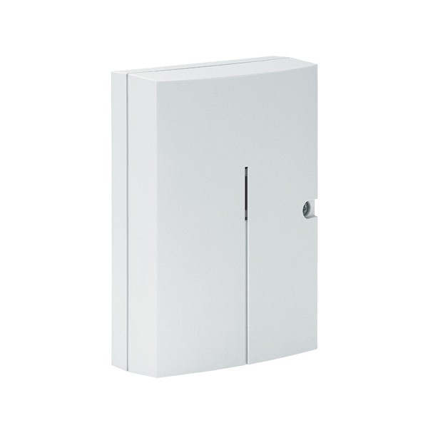 Drahtgebundenes Schaltrelaismodul. Zwei potentialfreie Relais im Aufputzgehäuse. Zur Schaltung von Lasten, gesteuert z.B. über die programmierbaren Halbleiterausgänge der Alarmzentralen der System 6000/8000 Reihen sowie der GSM206. Steuerspannung: jeweils 12V DC. Wechsler-Relais-Ausgang: jeweils 16A/250V AC (max. Schaltleistung: 4000 VA, Spitzenlast bis 30A für bis zu 3 Sekunden). Statusanzeigen: grüne bzw. rote LED. Arbeitsstromverbrauch: ca. 30mA. Abmessungen: 76 x 110 x 33mm.