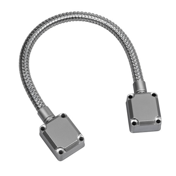 Kabelübergang Edelstahl, für Fenster / Türen, mit Endkappen zur Montage an Türrahmen und Türblatt. Schlauch aus Edelstahl: Länge 390mm, Außendurchmesser 13mm, Innendurchmesser 10,5mm, passend für max. 7,5mm Kabeldurchmesser, mind. Biegeradius 60mm. Endkappen aus galvanisierter Aluminiumdruckgusslegierung mit Abmessungen: 47 x 40 x 22mm. Gesamtlänge: ca. 480mm.