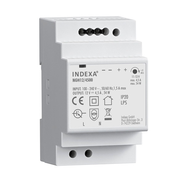 Hutschienen-Netzteil 12V/4,5A Netzgerät für die Gebäudetechnik, Schaltnetzteil 12V DC, max. 4,5A, 54W, zur Montage auf 35mm DIN-Normschienen (TS35, 3 TE). Eingang: 100-240V AC, Ausgang: 11-13 V DC einstellbar. LED-Statusanzeige. Abmessungen: 53 x 90 x 59mm.