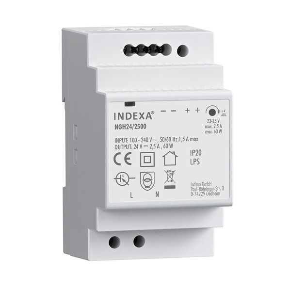 Hutschienen-Netzteil 24V/2,5A Netzgerät für die Gebäudetechnik, Schaltnetzteil 24V DC, max. 2,5A, 60W, zur Montage auf 35mm DIN-Normschienen (TS35, 3TE). Eingang: 100-240V AC, Ausgang: 23-25V DC einstellbar. LED-Statusanzeige. Abmessungen: 53 x 90 x 59mm.