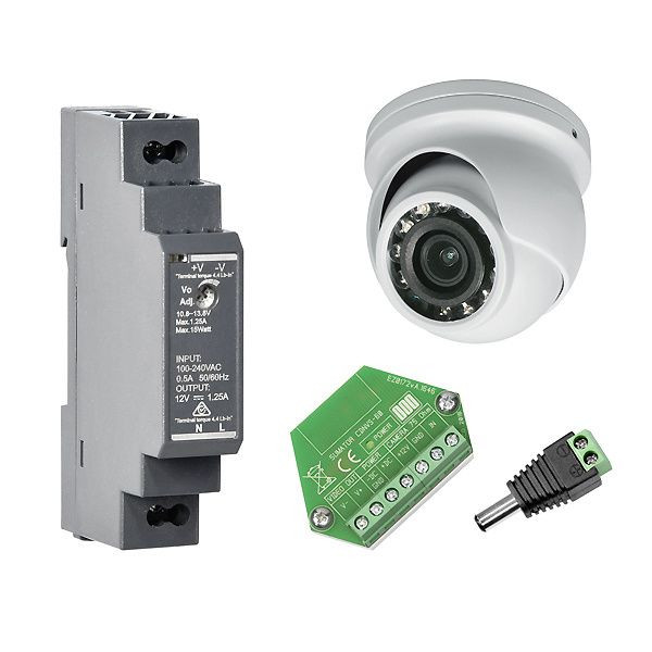 Abgesetzte Kamera für VT100 Türsprechsystem mit Zubehör. Bestehend aus Kamera IND2421 mit 12V Hutschienen-Netzteil NGH12/1200 und Video-Converter VT100VC1. Wetterfeste Micro-Tag/Nacht-Kugelkamera in besonders kompaktem, weiß lackiertem Aluminiumgehäuse. Ideal geeignet für Hauseingänge. Inkl. 2,8mm Weitwinkel-Fixobjektiv (horizontaler Erfassungswinkel 96°), 12 Infrarot-LEDs (Nachtsicht bis 12m). Schutzart IP66. Wand- oder Deckenmontage. Farbe: weiß ähnlich RAL 9003. Abmessungen: D 60 x 57mm.