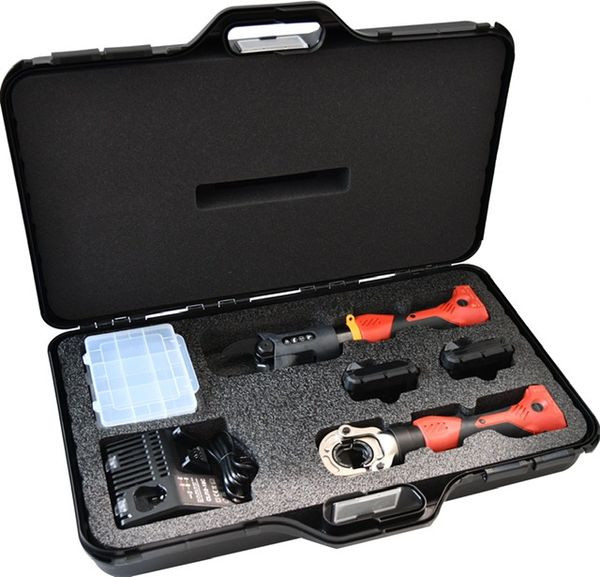 Professionelle Werkzeuge im Doppelpack, STILO60 ist geeignet zum Verpressen von Aluminium- und Kupferkabeln bis 300qmm, STILO-S40 ist geeignet zum Schneiden von fein- und mehrdrähtigen Aluminium- und Kupferbabeln bis zu einem max. Durchmesser von 40mm, die SET-Bestückung besteht aus der hydraulischen Akkupresse, dem hydraulischen Akkuschneider, einem Kunststoffkoffer zur Aufnahme der Werkzeuge und der Presseinsätze, Bedienungsanleitungen, zwei Li-Ionen Akkus, einem Ladergerät, einem USB-Kabel, Software
