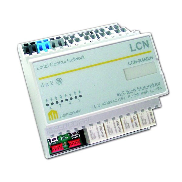 Der LCN-R4M2H ist ein Relaisblock zur Ansteuerung von bis zu acht Motoren (4x zwei Motore) des LCN Bussystems. Er wird an intelligente LCN Bus-Module wie LCN-SH, LCN-SHS, LCN-HU oder LCN-LD angeschlossen. Die Kontakte sind so vorverdrahtet und auf Klemmen gelegt, dass sich 230V Motore besonders einfach anschließen lassen. 4 Motoren sind einzeln steuerbar. Der LCN-R2M4H Relaisblock wird zur Ansteuerung von bis zu acht 230V Motorantrieben verwendet. Dabei werden je zwei Motore parallel angesteuert. Einsatzgebiete sind vorzugsweise Verdunkelungs- bzw. Sonnenschutzanlagen. Binärsensoren (LCN-BS4) können gleichzeitig mit dem LCN-R4M2H betrieben werden, so dass auch eine Positionssteuerung möglich ist.