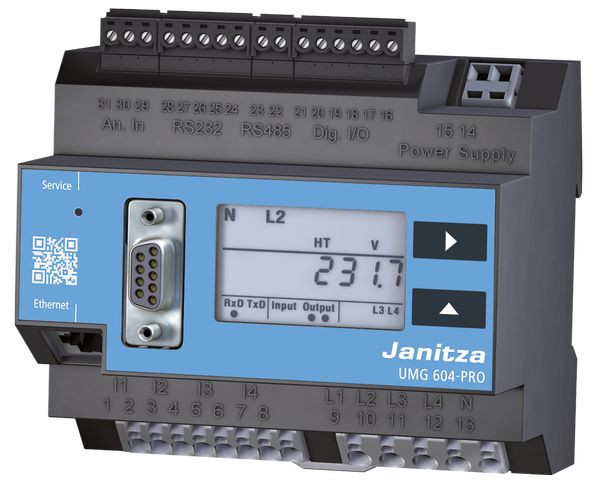 Power Analyser (UL)Versorgungsspannung: 95 .. 240V (45-65Hz); 135 .. 340V DC Messkategorie: 300V CATIII 4 Spannungsmesseingänge, 4 Strommesseingänge Messbereich: L - N: 10 -300V; L - L: 17 - 520V; 45 - 65Hz Stromwandler: ../1, ../5A 2 Digitaleingänge, 2 Digitalausgänge 1 Temperatur-Messeingang Zusatz-Speicher: 128MB Flash Schnittstellen: RS232, RS485 Schnittstelle: Profibus DP V0Schnittstelle: Ethernet 10/100 BaseTXInkl.Web-Server sowie folgenden APP`s:APP Messwertmonitor: Grafische Darstellung von online & historischen Messwerten APP IEC 61000-2-4 Watchdog Light PRO: Überwachung der Spannungsqualitäts-Grenzwerte nach IEC 61000-2-4Programmiersoftware „ GridVis Basic” download: www.janitza.de/gridvis-download.htmlIm Lieferumfang enthalten: Art.Nr.: 0801505, Cross-Patch-Kabel, CAT5e, 2m,Art.Nr.: 5200008, RS485 Abschlusswiderstand 120OhmArt.Nr.: 3303338 Schnelleinstieg UMG 604 inkl. Sicherheitshinweise inkl. Software-GridVis Schnelleinstieg UMG 604