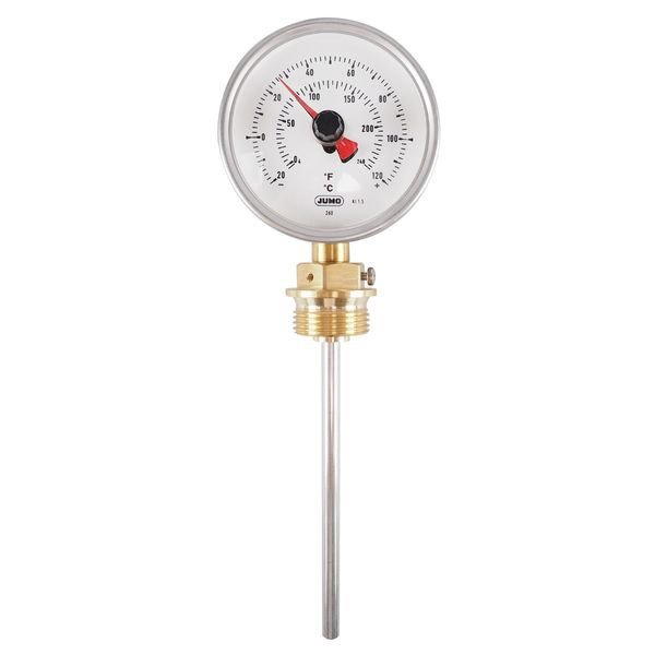 Das Thermometer hat ein Gehäuse aus Edelstahl (1.4301) mit einem Durchmesser von 80 mm. Das verwendete Messsystem arbeitet nach dem Prinzip der Bimetallwendel, die direkt über eine Achse auf den Zeiger wirkt. Die Temperatur kann auf einer weißen Skala mit schwarzer Schrift, die durch eine hochwertige Acrylglasscheibe (PMMA) geschützt ist, abgelesen werden. Die Temperatur wird in °C und °F angezeigt. Durch einen zusätzlichen Schleppzeiger wird die maximal erreichte Prozesstemperatur registriert und angezeigt. Das Gehäuse hat Schutzart IP55 und kann in Grenztemperaturen von -30 bis 80 °C eingesetzt werden, die Nennlage ist beliebig. Befestigt wird das Gerät durch ein Edelstahl Schutzrohr mit einem Durchmesser von 8 mm und einem Gewinde der Verschraubung ist G 1 Form A nach DIN 3852/2. Der Tauchrohrabgang ist radial nach unten vom Gehäuse abgehend. Da keine zusätzliche Hilfsenergie benötigt wird ist das Gerät für eine energiesparende Temperaturmessung optimal geeignet. Weiterhin ist es unempfindlich gegen Umgebungstemperatreinflüsse. Das Gerät wird u.a. im Tranformatorenbau verwendet. Es ist universell einsetzbar und zur örtlichen Temperaturmessung geeignet.