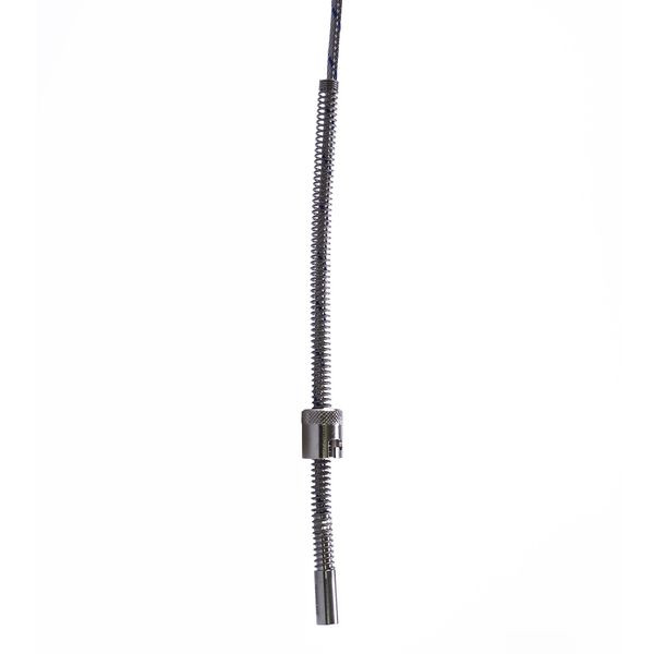 Das einsteckbare Thermoelement mit Bajonettverschluss (Durchmesser 12 mm) und 2,5 m langer Ausgleichsleitung aus Metallgeflecht eignet sich mit Hilfe des Seebeck-Effekts zur Temperaturmessung in Festkörpern. Das Schutzrohr mit Durchmesser 8 mm aus hitzebeständigem Stahl, Werkstoff 1.4571, ist an der Spitze plan ausgeführt. Deshalb eignet sich diese Ausführung beispielsweise besonders gut für Messungen an Gleitlagern und Werkzeugen. Der Einstellbereich der Einbaulänge an der Feder beträgt 20 bis 180 mm. Das Einfach-Thermoelement 1x Fe-CuNi L nach DIN 43710 ist für Temperaturen von 0 bis 400 °C ausgelegt. Die Ausgleichsleitung hält Umgebungstemperaturen von -20 bis +350 °C stand.