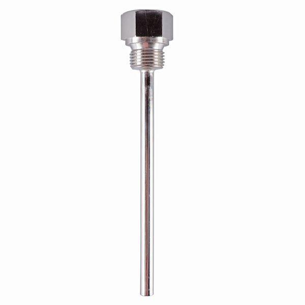 Die Schutzhülse zum Einschrauben aus Messing vernickelt ist passend für einen Fühler mit Durchmesser 6 mm. Montiert wird die Hülse mit einem Gewinde G 1/2 Form A gemäß DIN 3852/2. Die maximale Druckbelastbarkeit bei einer Temperatur von 150 °C beträgt 48 bar.