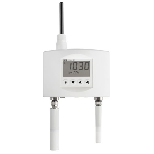 Der Funk-Messwertgeber wird in Verbindung mit einem separat erhältlichen Empfänger zur Messwerterfassung für Feuchte und Temperatur, sowie CO2 eingesetzt. Der Messwertgeber besitzt 2 Eingänge mit Steckanschluss M12 × 1, an denen digitale Sensoren (als Zubehör erhältlich) in beliebiger Kombination angeschlossen und erkannt werden (Plug-and-play). Der Messwertgeber eignet sich daher prinzipiell für viele Einsatzgebiete, wobei ein hoher Verdrahtungsaufwand umgangen werden soll oder überhaupt erst garnicht möglich ist. Die Freifeldreichweite des Funksignals beträgt 300 m. Maximal 4 Messwerte können erfasst werden. Sie werden mit einer Funkfrequenz von 868,4 MHz an den Empfänger des Funk-Messsystems übertragen, dort angezeigt und stehen als digitale oder analoge Ausgangsgröße zur Verfügung. Die Spannungsversorgung erfolgt extern (DC 18 bis 30 V) oder intern durch 4 Lithium-Batterien (Baugröße AA). Mit dem empfohlenen Batterietyp beträgt die Batterielebensdauer 1 Jahr (bei werkseitiger Einstellung und einem Sensor). Die Elektronik des Messwertgebers mit hintergrundbeleuchteter LCD-Anzeige und Bedientasten ist in ein Wandgehäuse (Schutzart IP65) eingebaut. Der Umgebungstemperaturbereich des Messwertgebers beträgt -30 bis +80 °C, wobei die abweichenden Umgebungstemperaturen der Sensoren und Lithium-Batterien zu berücksichtigen sind. Die Konfiguration des Messwertgebers lässt sich über die USB-Schnittstelle oder die Bedientasten einstellen.