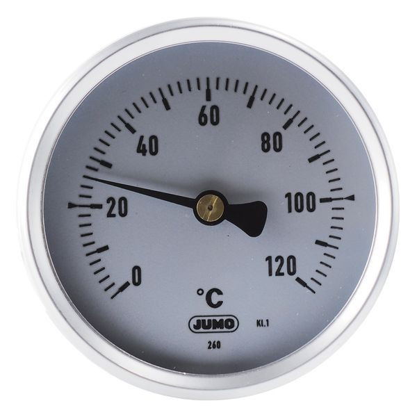 Das Thermometer hat ein Gehäuse aus Edelstahl mit einem Durchmesser von 80 mm. Das verwendete Messsystem arbeitet nach dem Prinzip der Bimetallwendel, die direkt über eine Achse auf den Zeiger wirkt. Die Temperatur kann auf einer Aluminium Skala mit schwarzer Schrift, die durch eine Glasscheibe geschützt ist, abgelesen werden. Das Gehäuse hat Schutzart IP54 und kann in Grenztemperaturen von -30 bis 80 °C eingesetzt werden, die Nennlage ist beliebig. Befestigt wird das Gerät durch ein Edelstahl Verschraubung, die auf dem Edelstahl Tauchrohr mit einem Durchmesser von 6 mm beliebig verschoben werden kann. Das Gewinde der Verschraubung ist G 1/2 Form A nach DIN 3852/2. Der Tauchrohrabgang ist axial nach hinten abgehend auf der Rückseite des Gehäuses. Da keine zusätzliche Hilfsenergie benötigt wird ist das Gerät für eine energiesparende Temperaturmessung optimal geeignet. Weiterhin ist es unempfindlich gegen Umgebungstemperatreinflüsse. Das Gerät ist universell einsetzbar und zur örtlichen Temperaturmessung geeignet.