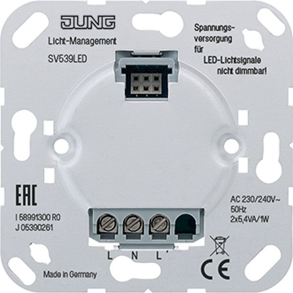 Nicht dimmbar. (Schraubbefestigung, ohne Befestigungskrallen) Das "Netzteil" dient ausschließlich zur Spannungsversorgung der LED-Lichtsignale (Art.-Nr. ..539..). Es ist nicht dimmbar. Nennspannung: AC 230 ... 240 V ~ Netzfrequenz: 50 Hz Umgebungstemperatur: 0 ... +40 °C Anschlüsse: L, N, L' Schutzklasse (bei montiertem Aufsatz): II Leistungsaufnahme (bei montiertem Aufsatz): typ. 2 x 5,4 VA / 2 x 1,0 W Anschluss Schraubklemmen Max. klemmbarer Leiterquerschnitt: 2 x 2,5 mm2 oder 1 x 4 mm2