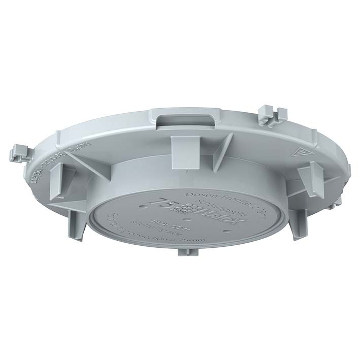 HaloX® 100 Frontteile (1281-02). Für die Verarbeitung im Ortbeton ist das formstabile HaloX®-System modular aufgebaut. Drei Gehäusedurchmesser mit einer Vielzahl an runden, quadratischen sowie universellen Frontteilen ermöglichen die Integration von Leuchten und Lautsprechern bis zu einem Einbaudurchmesser von 250 mm ? auch bei Sichtbeton. Mit Tunnel bietet das System ausreichend Raum für die Aufnahme von Betriebsgeräten, z. B. LED-Treiber. Optionale Verlängerungsringe dienen der Vergrößerung der Einbautiefe. Alle Frontteile sind feuchtigkeitsabweisend und können bereits vor dem Verlegen der ersten Bewehrung exakt positioniert und aufgenagelt werden. Gehäuse und Frontteile werden kraftschlüssig und stabil miteinander verrastet und lassen sich auch nachträglich noch frei ausrichten. Durch die werkzeuglose Öffnungstechnik mit Kombinationseinführung M20/M25 können Rohre einfach und schnell eingeführt werden und selbst bei Fehlbelegung lässt sich die Einführung einfach wieder verschließen. Sie bietet eine sichere Rohrrückhaltung mit Tiefenanschlag, so dass ein nachträgliches innenseitiges Kürzen der Rohre entfällt. Nach dem Vergießen lassen sich Frontteile mit definiertem Einbaudurchmesser durch einen gezielten Hammerschlag öffnen. Die Frontteile für universelle Öffnungsmaße können flächig an- oder überspachtelt werden. Anschließend erfolgt die Erstellung der gewünschten Installationsöffnung mit herkömmlichen Fräswerkzeugen, z. B. MULTI 4000. Installationsart: Ortbeton | Frontteil Form: Runder Deckenauslass | Einbaudurchmesser Leuchte / Lautsprecher: 75 mm | Leuchtenblende min. Ø: 82 mm