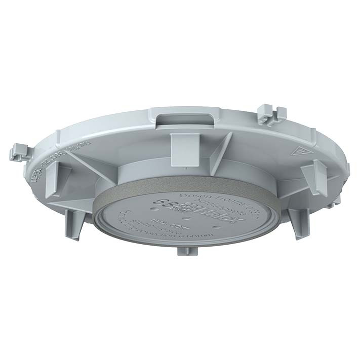 HaloX® 100 Frontteile für Sichtbeton (1281-61). Für die Verarbeitung im Ortbeton ist das formstabile HaloX®-System modular aufgebaut. Drei Gehäusedurchmesser mit einer Vielzahl an runden, quadratischen sowie universellen Frontteilen ermöglichen die Integration von Leuchten und Lautsprechern bis zu einem Einbaudurchmesser von 250 mm ? auch bei Sichtbeton. Mit Tunnel bietet das System ausreichend Raum für die Aufnahme von Betriebsgeräten, z. B. LED-Treiber. Optionale Verlängerungsringe dienen der Vergrößerung der Einbautiefe. Alle Frontteile sind feuchtigkeitsabweisend und können bereits vor dem Verlegen der ersten Bewehrung exakt positioniert und aufgenagelt werden. Gehäuse und Frontteile werden kraftschlüssig und stabil miteinander verrastet und lassen sich auch nachträglich noch frei ausrichten. Durch die werkzeuglose Öffnungstechnik mit Kombinationseinführung M20/M25 können Rohre einfach und schnell eingeführt werden und selbst bei Fehlbelegung lässt sich die Einführung einfach wieder verschließen. Sie bietet eine sichere Rohrrückhaltung mit Tiefenanschlag, so dass ein nachträgliches innenseitiges Kürzen der Rohre entfällt. Nach dem Vergießen lassen sich Frontteile mit definiertem Einbaudurchmesser durch einen gezielten Hammerschlag öffnen. Die Frontteile für universelle Öffnungsmaße können flächig an- oder überspachtelt werden. Anschließend erfolgt die Erstellung der gewünschten Installationsöffnung mit herkömmlichen Fräswerkzeugen, z. B. MULTI 4000. Installationsart: Ortbeton | Einbaudurchmesser Leuchte / Lautsprecher: 68 mm | Frontteil Form: Runder Deckenauslass | Leuchtenblende min. Ø: 80 mm | Installationsart: Sichtbeton