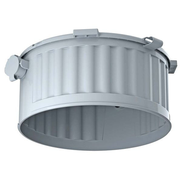 HaloX® 180 für Ortbeton (1282-00). Für die Verarbeitung im Ortbeton ist das formstabile HaloX®-System modular aufgebaut. Drei Gehäusedurchmesser mit einer Vielzahl an runden, quadratischen sowie universellen Frontteilen ermöglichen die Integration von Leuchten und Lautsprechern bis zu einem Einbaudurchmesser von 250 mm ? auch bei Sichtbeton. Mit Tunnel bietet das System ausreichend Raum für die Aufnahme von Betriebsgeräten, z. B. LED-Treiber. Optionale Verlängerungsringe dienen der Vergrößerung der Einbautiefe. Alle Frontteile sind feuchtigkeitsabweisend und können bereits vor dem Verlegen der ersten Bewehrung exakt positioniert und aufgenagelt werden. Gehäuse und Frontteile werden kraftschlüssig und stabil miteinander verrastet und lassen sich auch nachträglich noch frei ausrichten. Durch die werkzeuglose Öffnungstechnik mit Kombinationseinführung M20/M25 können Rohre einfach und schnell eingeführt werden und selbst bei Fehlbelegung lässt sich die Einführung einfach wieder verschließen. Sie bietet eine sichere Rohrrückhaltung mit Tiefenanschlag, so dass ein nachträgliches innenseitiges Kürzen der Rohre entfällt. Nach dem Vergießen lassen sich Frontteile mit definiertem Einbaudurchmesser durch einen gezielten Hammerschlag öffnen. Die Frontteile für universelle Öffnungsmaße können flächig an- oder überspachtelt werden. Anschließend erfolgt die Erstellung der gewünschten Installationsöffnung mit herkömmlichen Fräswerkzeugen, z. B. MULTI 4000. Installationsart: Ortbeton | Einbaudurchmesser Leuchte / Lautsprecher: 0-180 mm | Max. Einbautiefe Leuchte / Lautsprecher: 110 mm | Tiefe inkl. Frontteil: 120 mm | Betriebsgeräte Zusatzraum: Ohne Zusatzraum