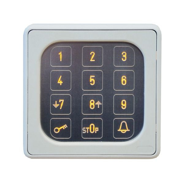 Diese beleuchtete Folientastatur wird als Bedienteil zu den Codierschaltgeräten Versa 4 und Versa 50 eingesetzt. Der Rahmen besteht aus stabilem Kunststoff und ist hellgrau durchgefärbt. Das Bedienfeld ist anthrazit foliert und hat gelb hinterleuchtete Ziffern. Das Gerät gibt bei Tastendruck einen Piepton als Bestätigung aus. Die Schrauben zum Öffnen bzw. Demontieren der Tastatur sind unter einem geclipsten Rahmen versteckt und können nur per beiliegendem Schraubereinsatz geöffnet werden. Das Anschlusskabel, welches zur Auswerteeinheit geführt werden muss, hat eine Länge von 5 Metern. Abmessungen: 75x75x14mm