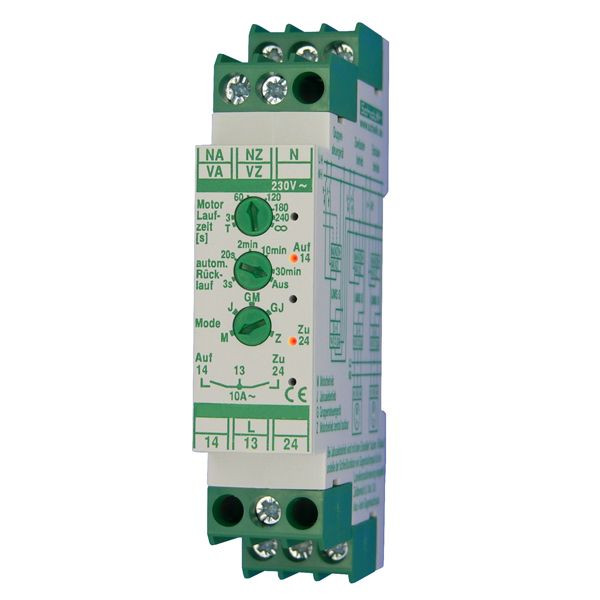 Dieses Mehrfachsteuergerät wird hauptsächlich als vorgeschaltetes Gruppensteuergerät in Rollladen- oder Jalousiesteuerungen verwendet. Es handelt sich um ein intelligentes Steuergerät mit einem Steuerausgang und zwei Steuereingängen. Durch die Flankensteuerung wird eine geschaltete Laufrichtung nach Ablauf der eingestellten Laufzeit auch bei weiter anstehendem Steuerbefehl zurückgestellt. Neben dem Einsatzzweck (z.B. Gruppensteuerung f. Rollladenantriebe, Gruppensteuerung f. Jalousieantriebe, Einzelsteuerung Rollladenantriebe, etc.) lassen sich über die Dreh-Potenziometer am Gerät noch die Laufzeit zwischen 3 und 240 Sekunden einstellen sowie ein automatischer Rücklauf zwischen 3 Sekunden und 30 Minuten aktivieren. Die Vor-Ort-Bedienung arbeitet mit einer Selbsthaltung entsprechend der eingestellten Laufzeit während die vorrangige Zentralbedienung im Totmannbetrieb arbeitet. Als Bedienelement können Taster, Schalter und Zeitschaltuhren eingesetzt werden. Die Steuer- und Versorgungsspannung beträgt 12-24V UC und die Schaltspannung beträgt 230V (50Hz). Die hochwertigen Schraubklemmen haben unverlierbare Schrauben und halten viele Öffnungen und Schließungen aus. Das Gerät ist für die Montage auf der DIN-Hutschiene konzipiert und die Breite beträgt 18mm (1 TE). Abmessungen: 88x58x18mm
