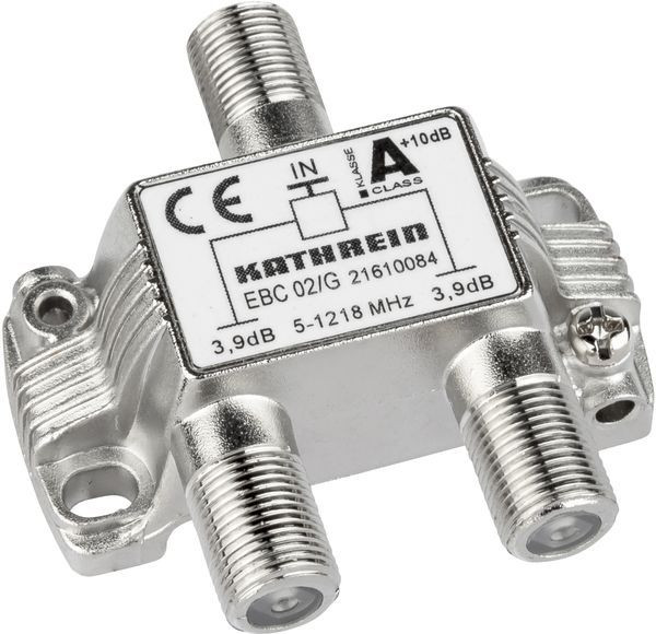 2fach-Verteiler, 3,9 dB, 5-1218 MHz, F-Connector, Trennkondensatoren an Ein- und Ausgaengen, Schirmungsklasse A gem. CENELEC EN 50083-2, Vodafone- KDG-Freigabe